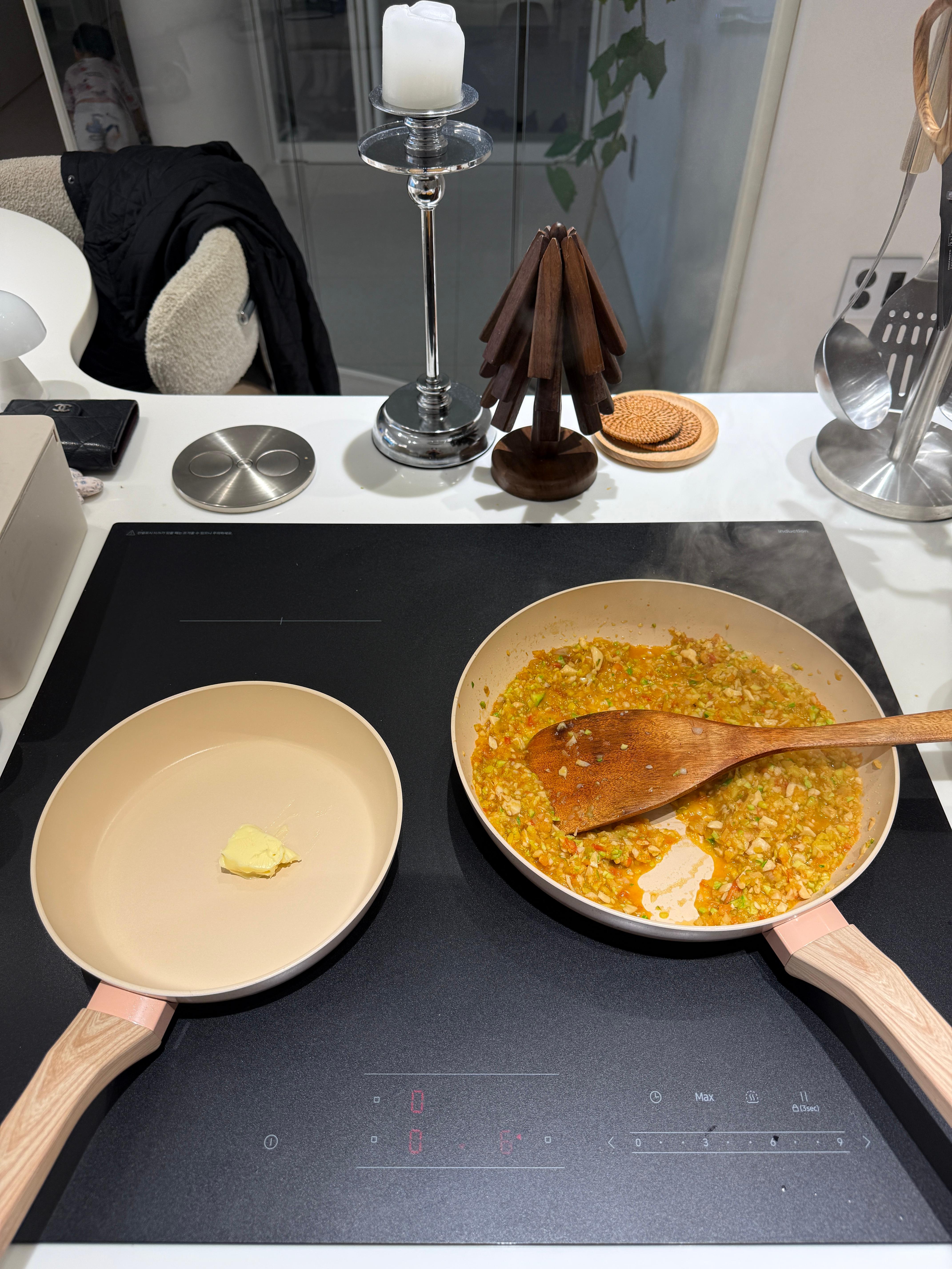 중불로 살살 볶아주면서 옆 화구도 팬을 놓고 버터 조금 올려주세요!