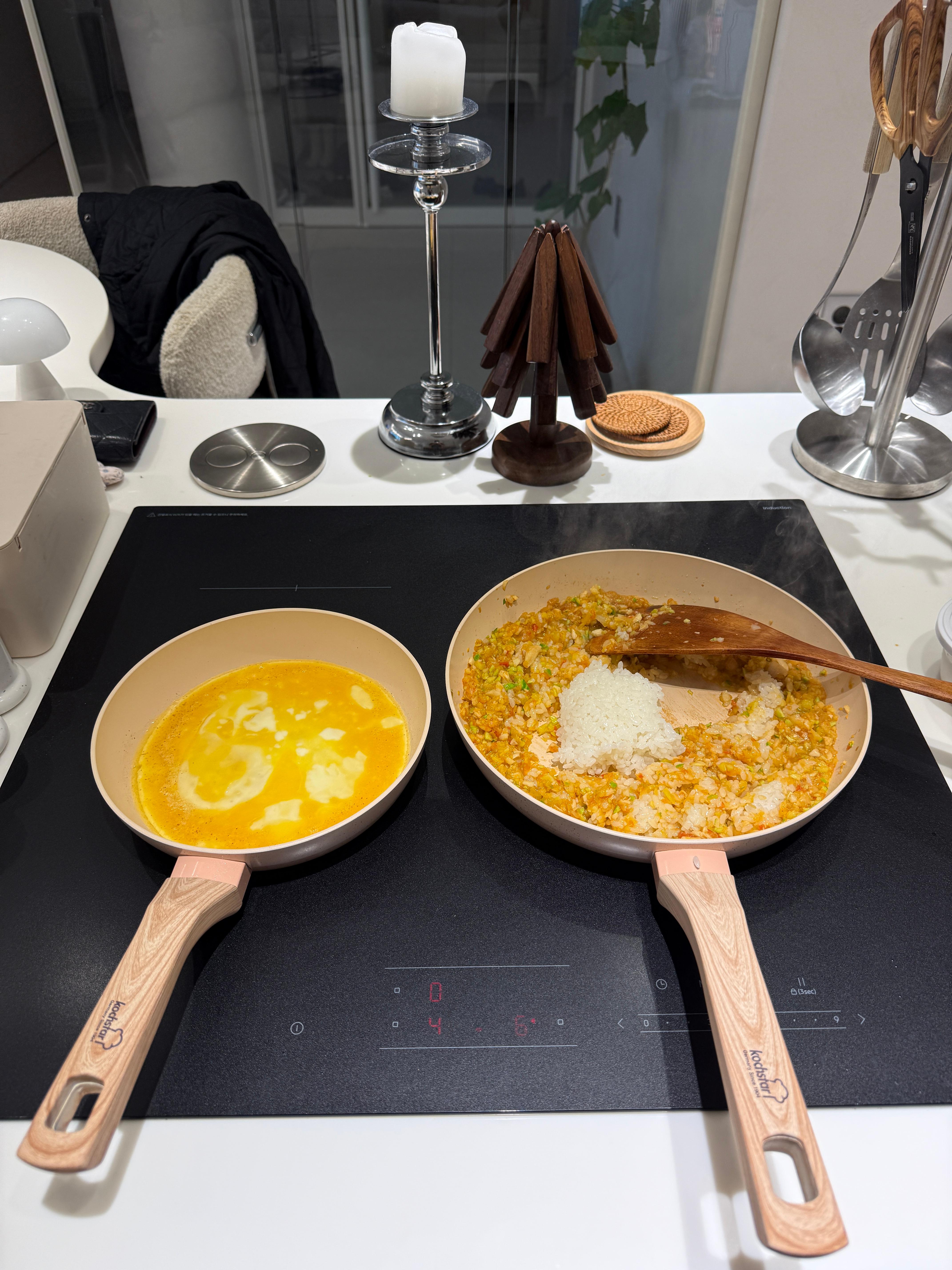 아까 풀어놓은 계란물 절반정도 붓고, 야채 볶은 팬에는 밥을 넣어줍니다.